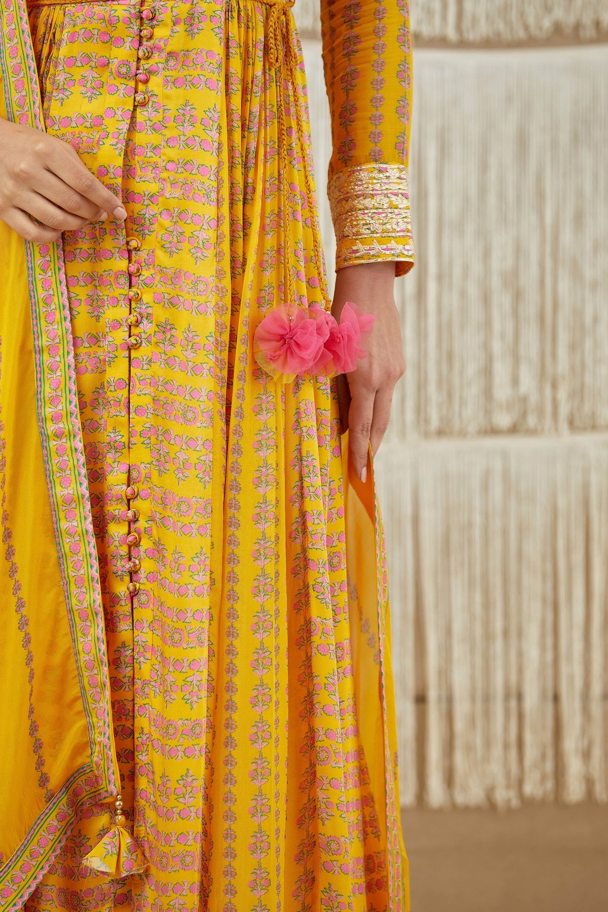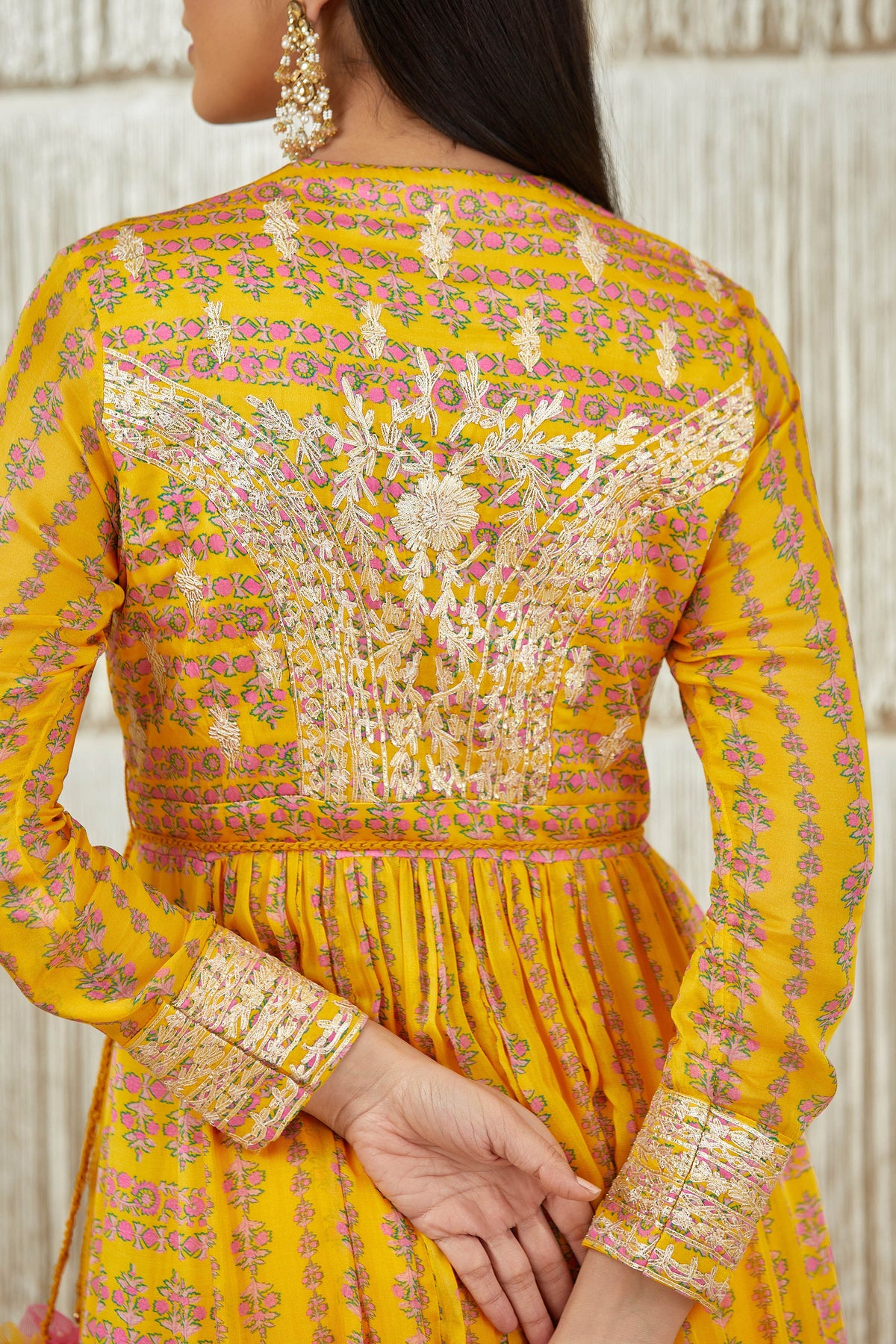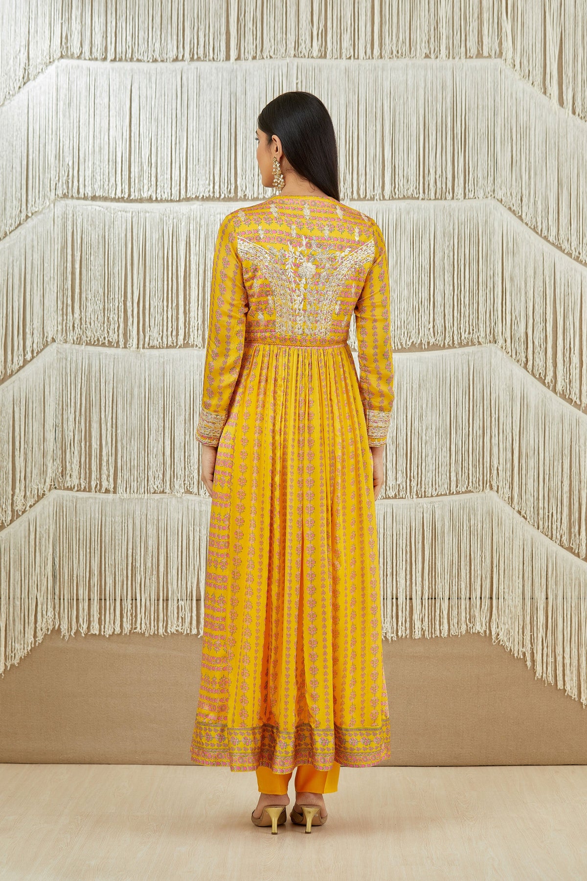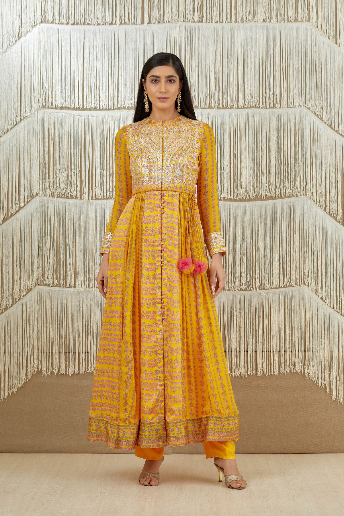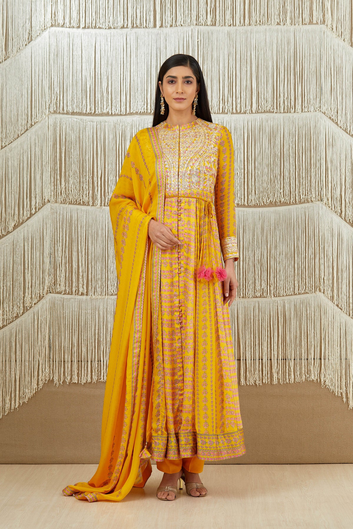 Gota embroidered printed anarkali with printed flat chiffon dupatta.