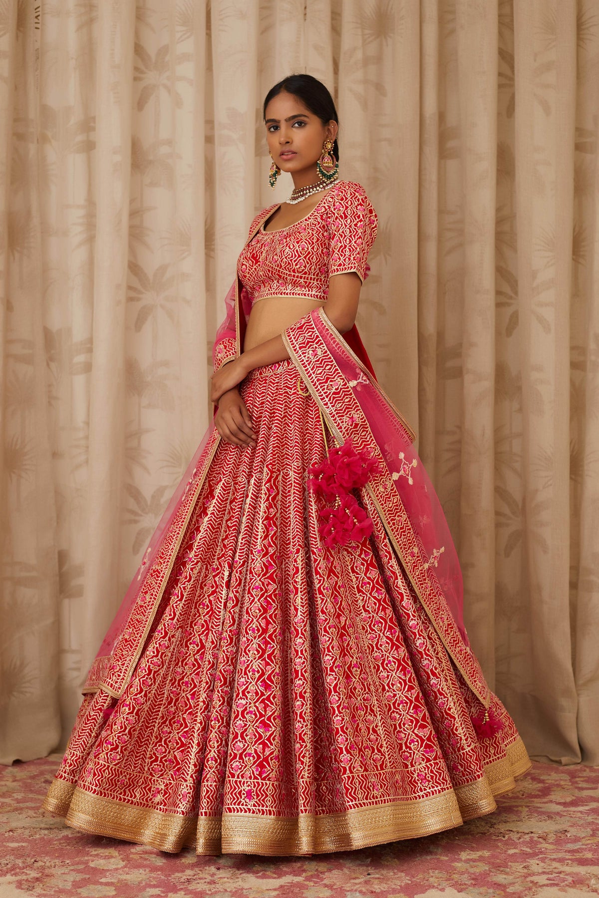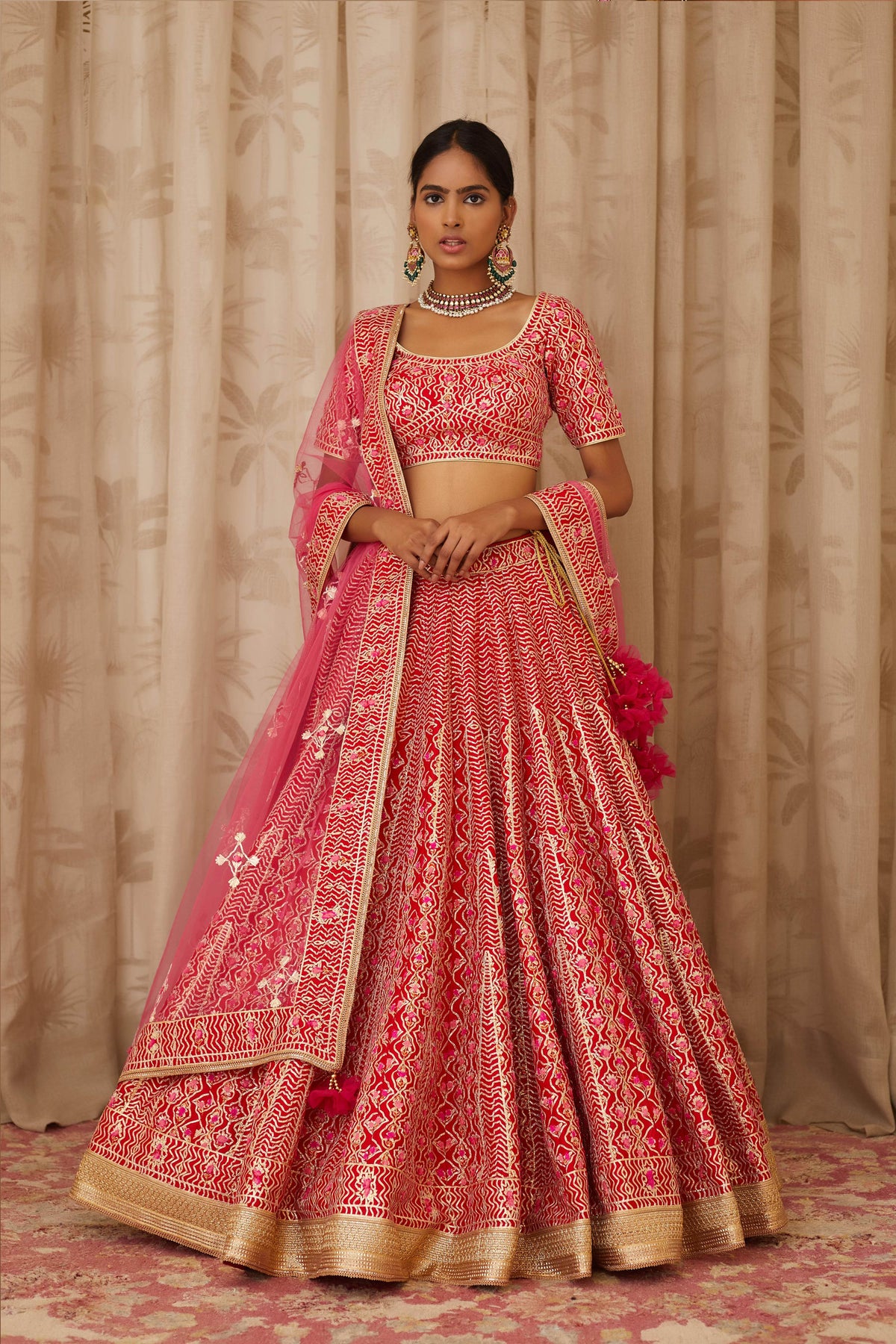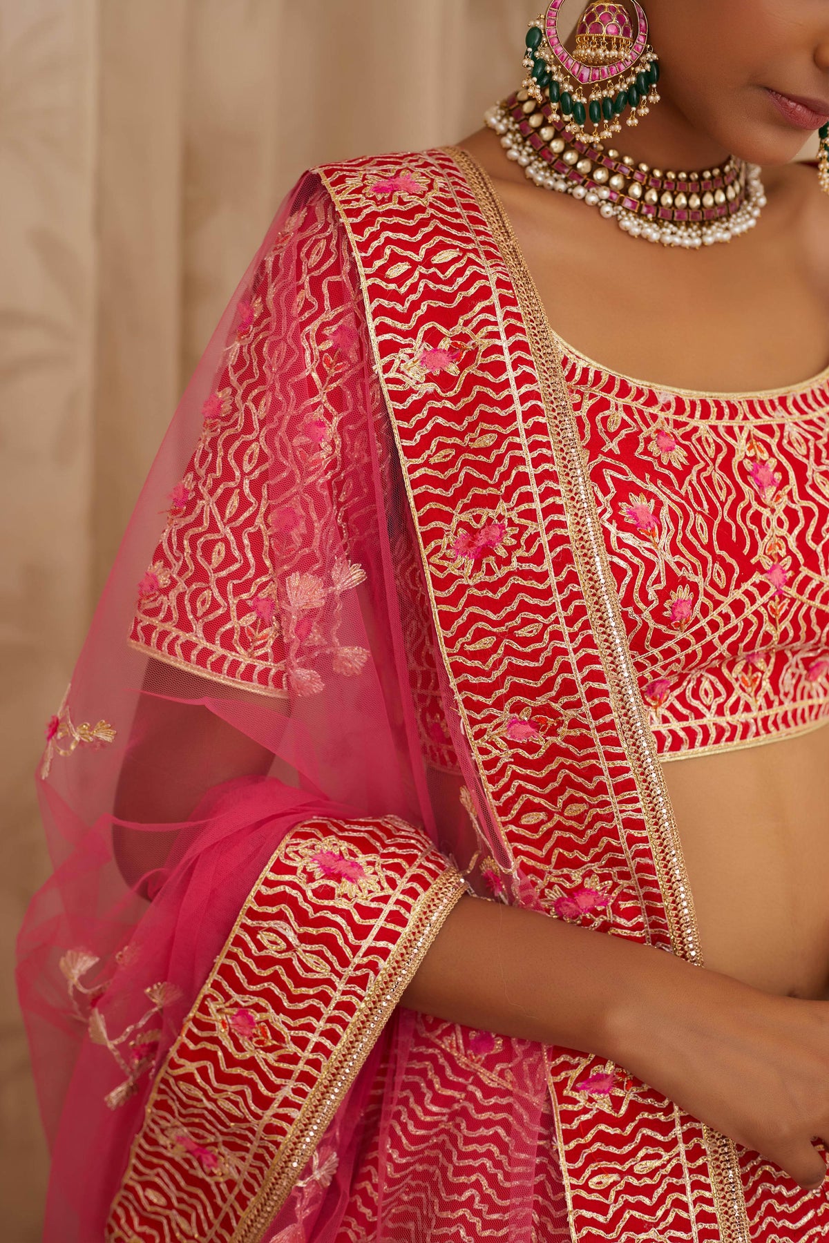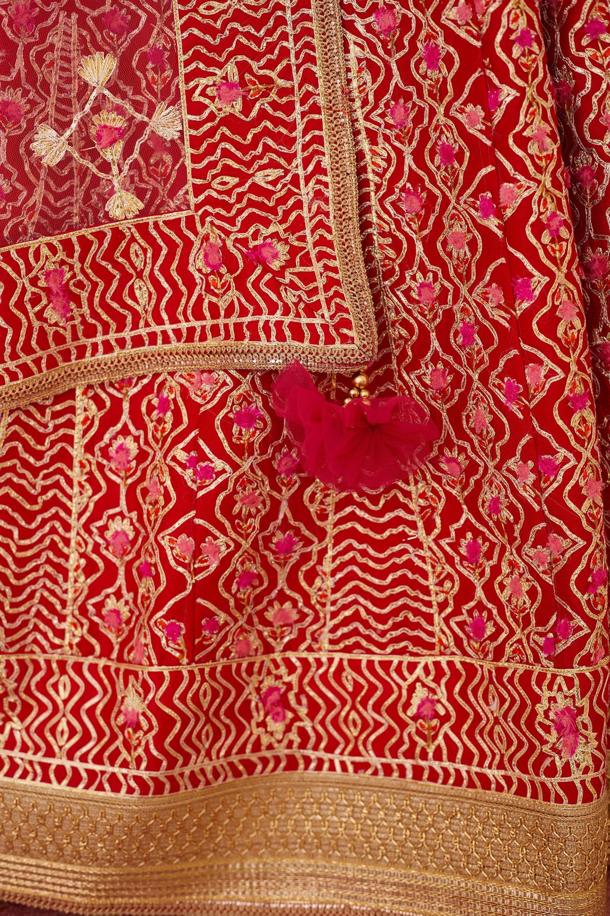 Gota and thread embroidered lehenga with blouse and dupatta.