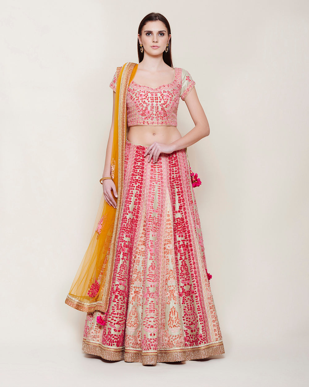 GOLD PINK THREAD VELVET EMBROIDERED LEHENGA