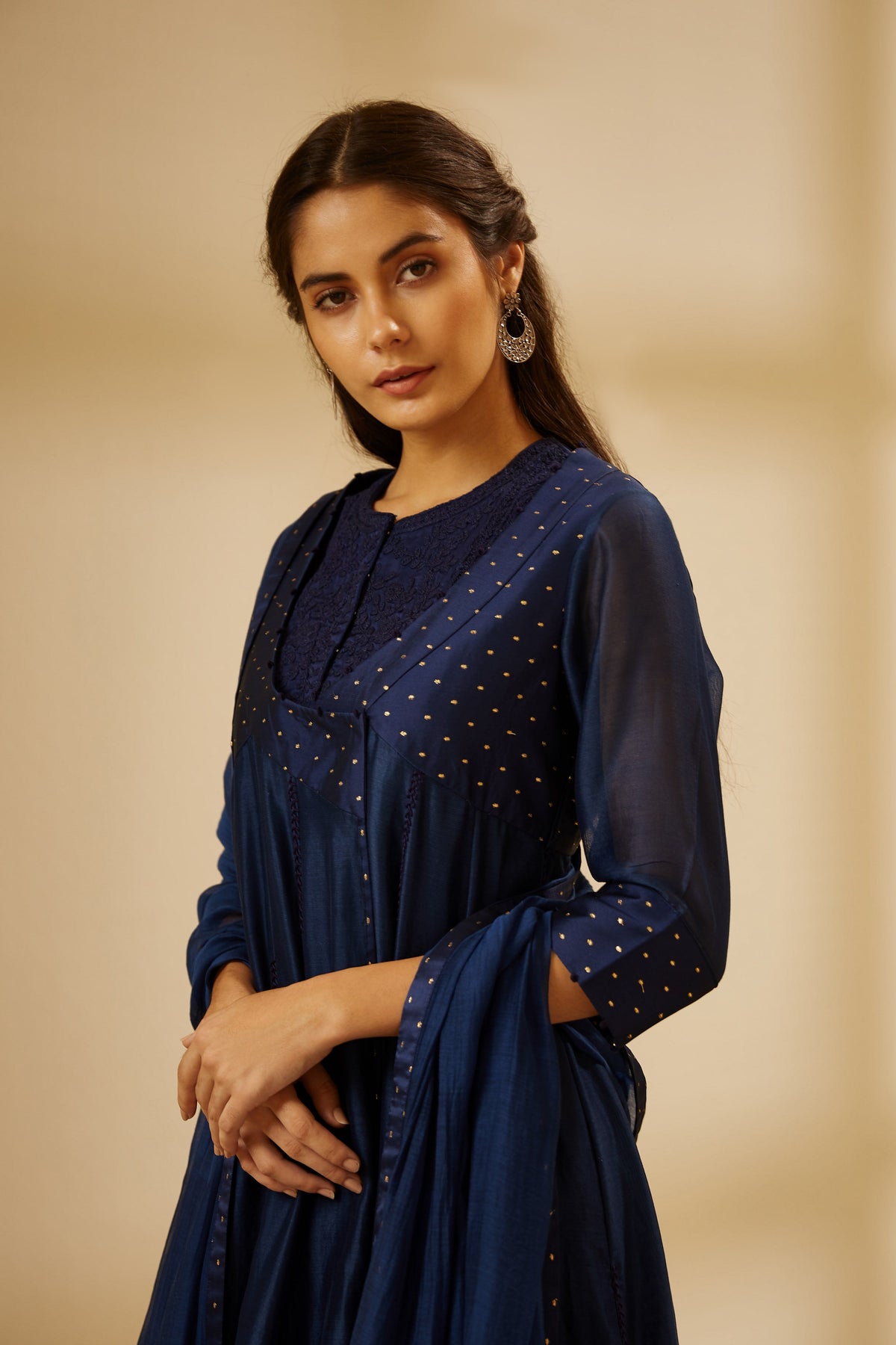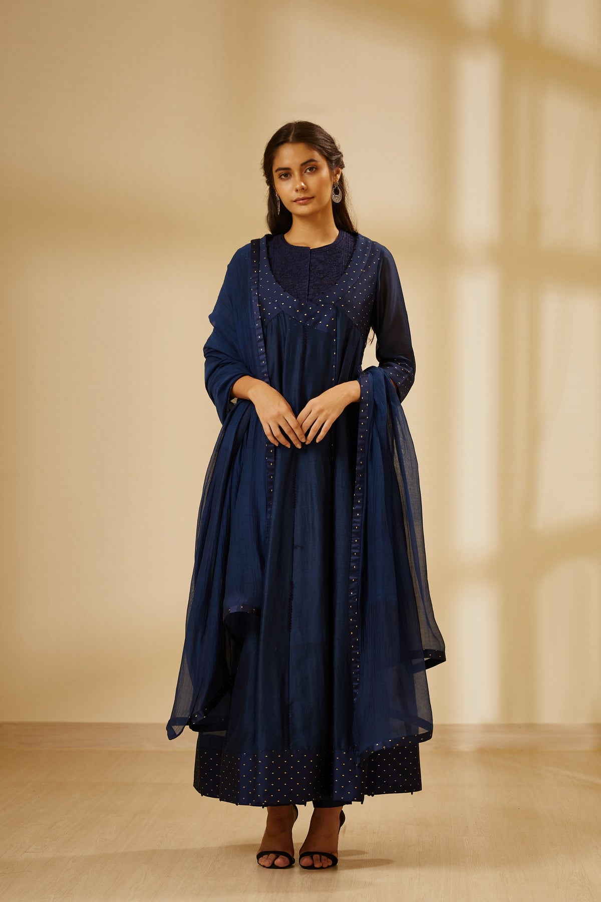 • Navy Blue thread embroidered chanderi angrakha with top trouser and dupatta.