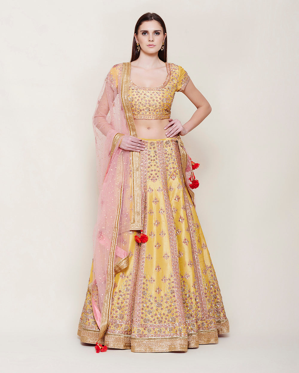YELLOW PINK GOLD ZARDOZI LEHENGA